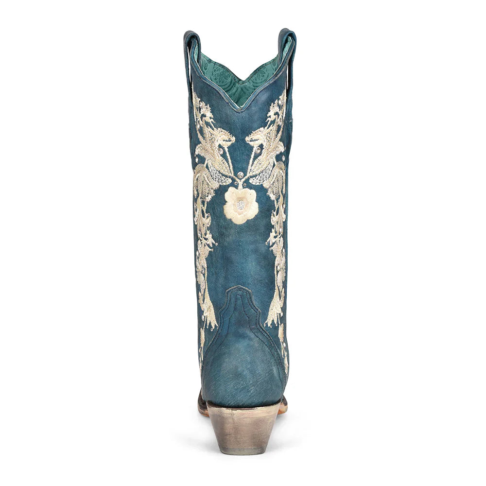 Turn heads with this navy blue cowgirl boot featuring detailed floral embroidery, sparkling crystals, and metallic studs. Crafted for style and durability, it combines bold Western flair with elegant detailing. Built on Goodyear welt construction, it’s handcrafted for lasting comfort and sophistication.