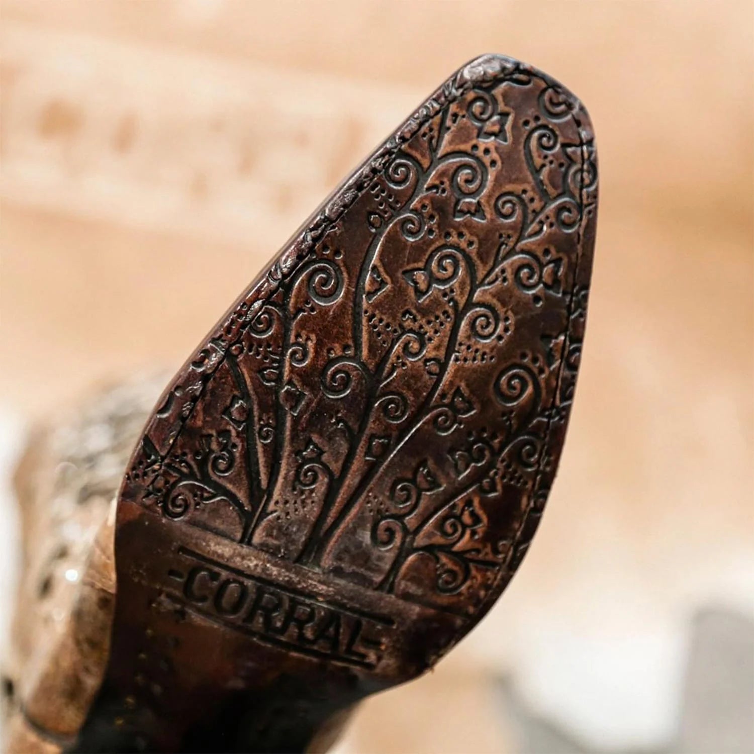 The Corral Black Brown boot is a stunning fusion of Western heritage and modern glamour. Designed with glitter inlays, studs, and crystals, this boot exudes elegance while maintaining its rugged cowboy roots. The snip toe enhances its sleek silhouette, offering a refined yet bold statement.