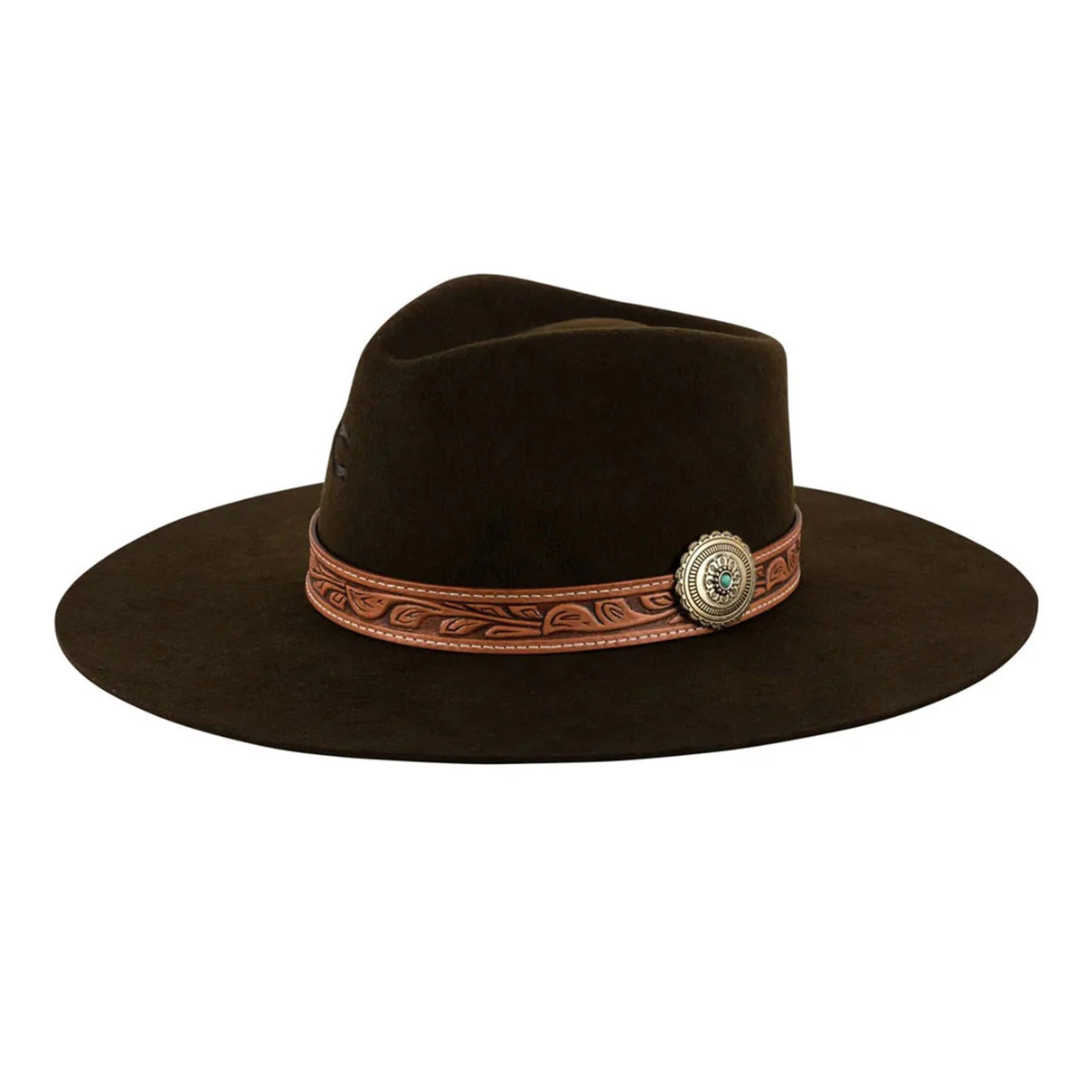 White as the dunes, winsome as can be, the White Sands dazzles from New Mexico to NYC. This ivory-colored wool hat offers a 4” pinch-front crown with a 3 3/4" brim. Its tooled leather hatband in reddish-brown is adorned with an antiqued silver concho featuring a floral design and a turquoise centerpiece. Further up, a silver arrow aims toward the heavens. A cloth sweatband ensures superior wearability. The White Sands is part of the Charlie 1 Horse Desert Collection.