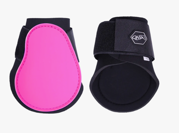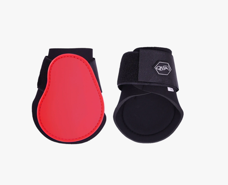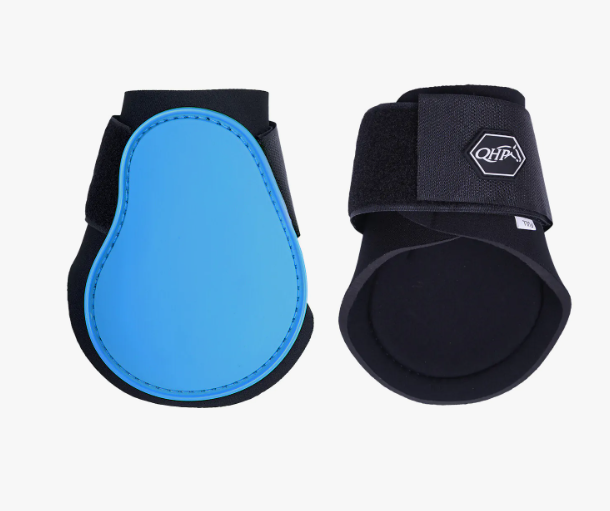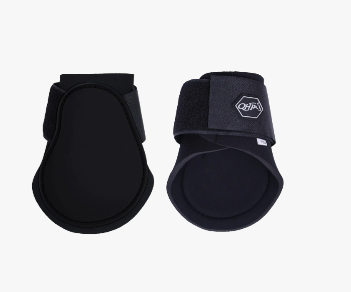et of two open fetlock boots with a hard shell and neoprene lining. With Hook-and-loop fastener. Protects the horse's legs against shocks and hits.