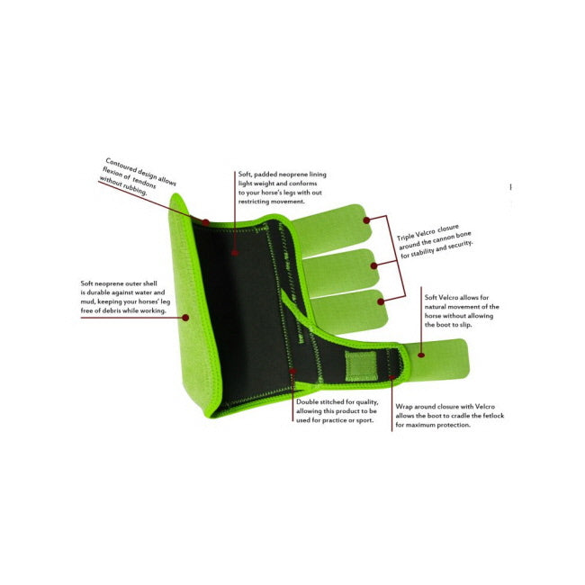 The boot's soft, padded neoprene lining provides an ultra-lightweight yet secure fit, conforming to the shape of your horse's leg without restricting movement. Its contoured design at the top allows for flexion of the tendons, ensuring natural movement and preventing any rubbing that could cause discomfort. The boot features a triple Velcro closure around the cannon bone, offering stability and security, while still allowing your horse to move freely. The wraparound closure with Velcro cradles the fetlock for maximum protection, making this boot perfect for all types of equine sports. Double-stitched for added strength, this boot is suitable for both front and back legs, ensuring full coverage and reliable protection in any setting.