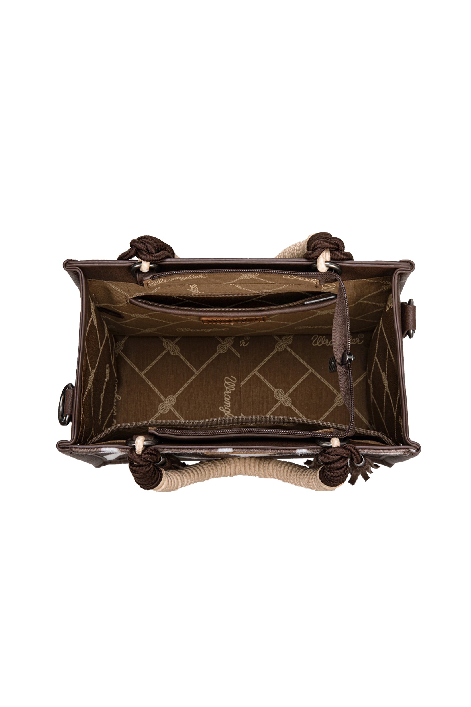 The bag showcases a striking cow print fabric, giving it a distinctive western-inspired style that pairs effortlessly with denim, boots, and country outfits. Adding extra character are the rope feature handles, which create a unique textured look while providing a comfortable grip when carrying the bag by hand.