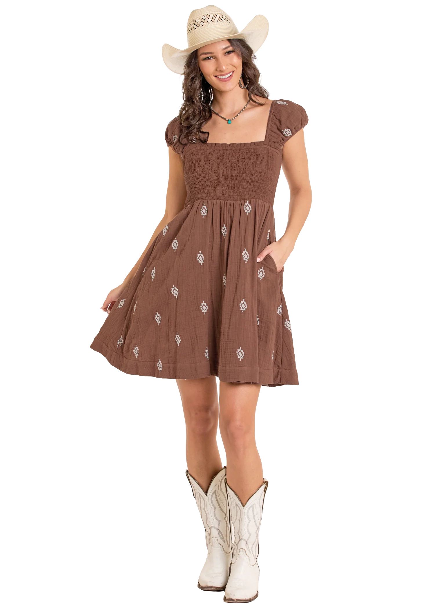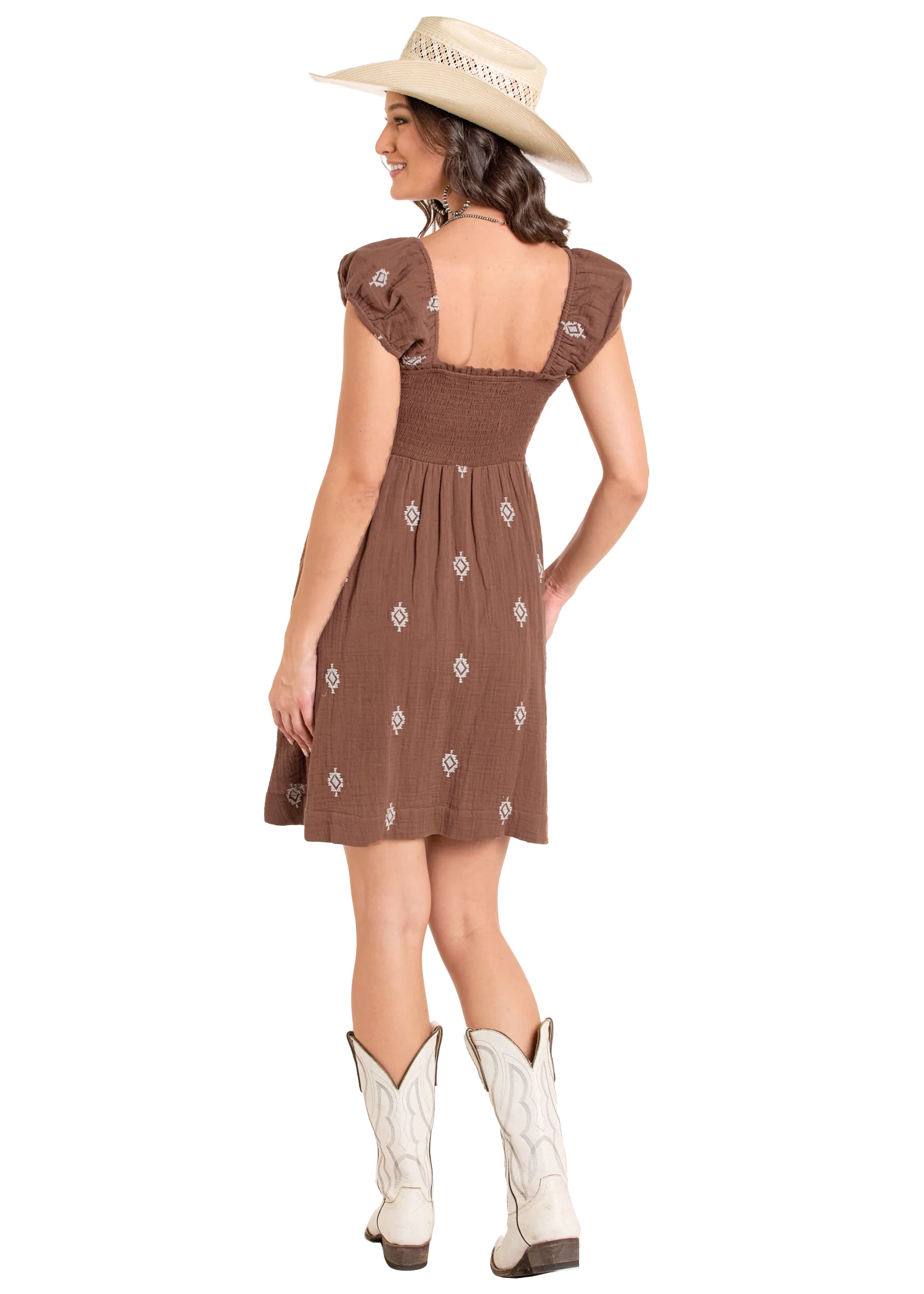 Add a touch of boho charm with the Aztec Embroidered Mini Dress. Made from 100% cotton, this dress features Aztec embroidery details with a smocked bodice, creating a stylish and comfortable look.