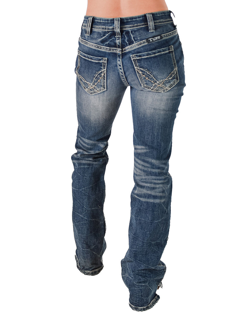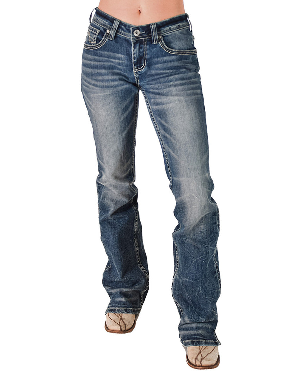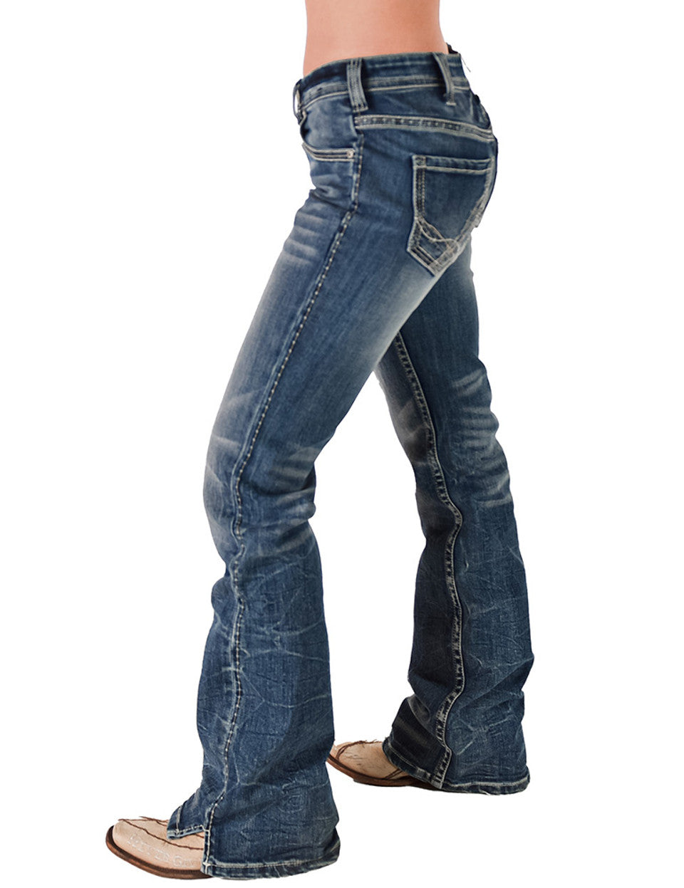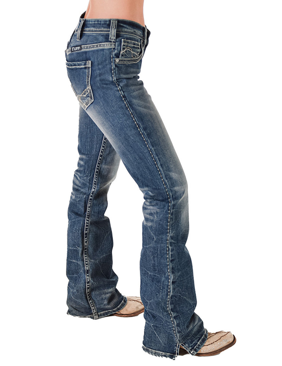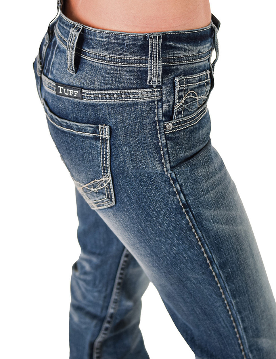 Mid-Rise Classic Fit Bootcut Fans here is your next favorite jean. The cool medium blue wash is made from our 12 oz low stretch, premium denim with the perfect hug to all your curves. They have a subtle side tan stitching down both legs and finished off with a slit hem. Check out the unique barbwire stitching on the back pockets that are stitched in earthtones for ease to wear with everything. These are running true to size.