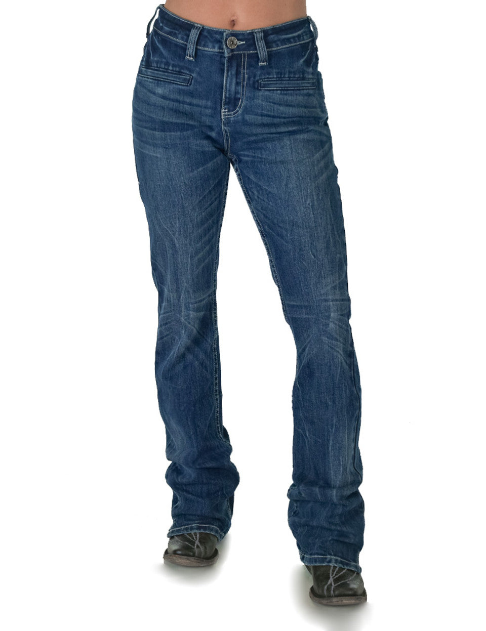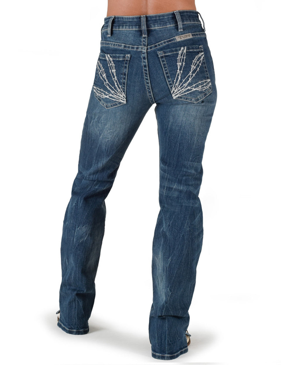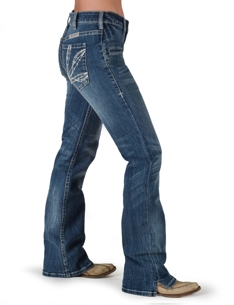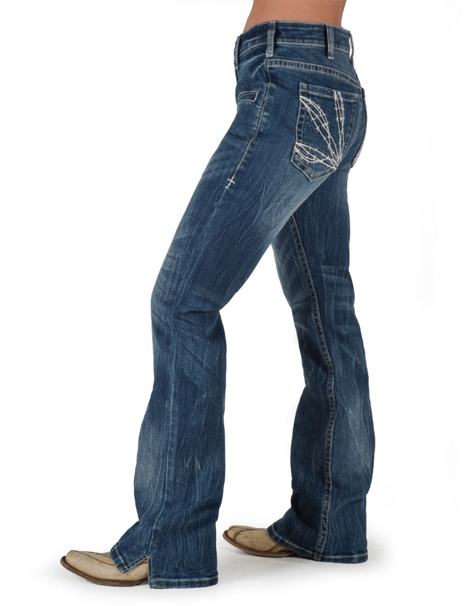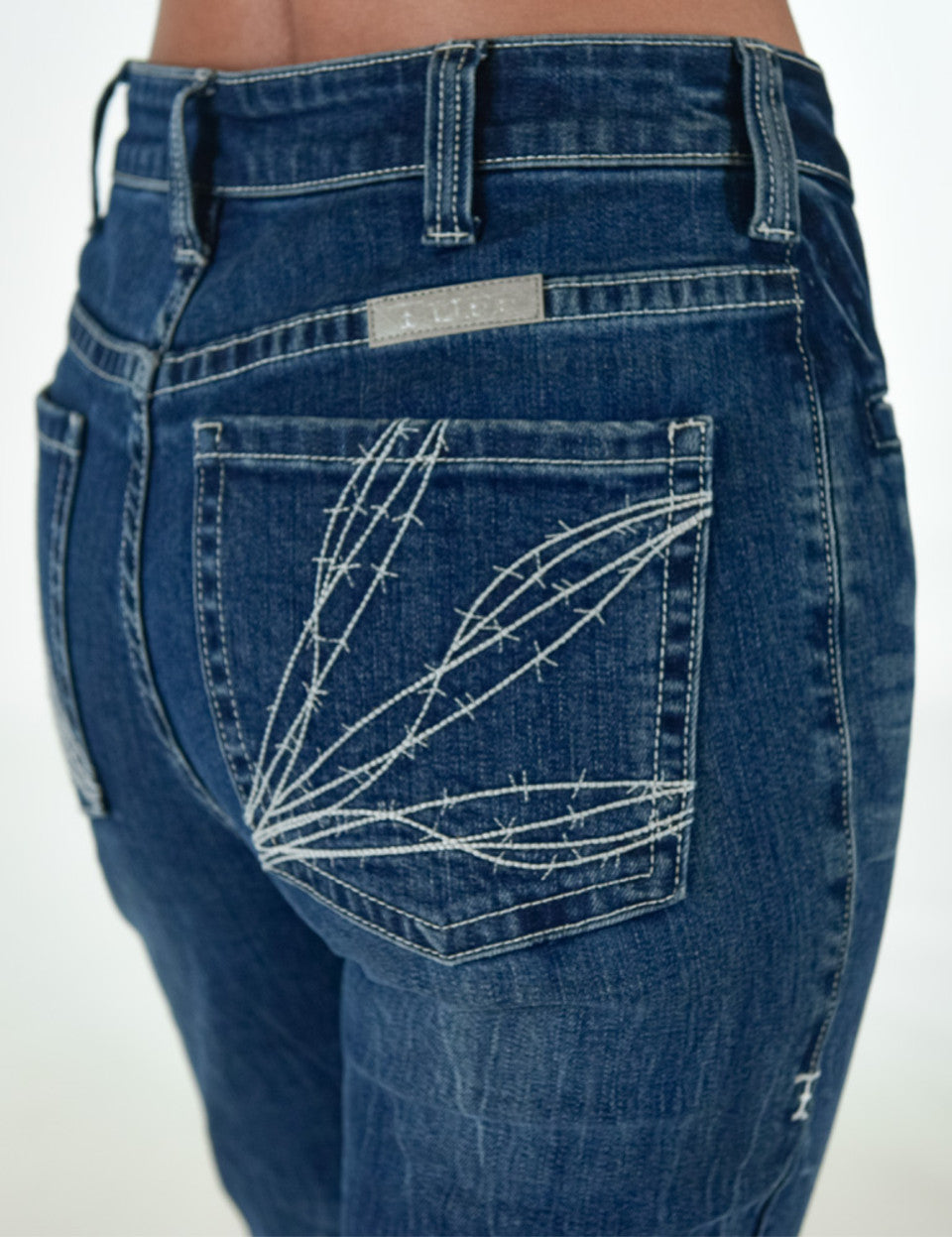 New Look & New High Waist Fit! Eye catching triple white barbwire stitching on these bigger, higher set back pockets are right on trend. Check out this incredible medium wash with the perfect whisking & creasing. These high waisted jeans are made with our low stretch 98/2 premium 12 oz denim for that firm fit you are looking for. Look at the front welt pockets that are not just for decorations as they are 6” deep. We finished these off with a slit hem that is a fan favorite. These are running true to size.
