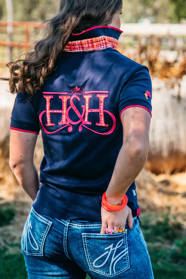 Another super comfortable all year round option from H&H, this new release, loose fitting polo is offered in a navy base fabric with new seasons orange check, ranch range contrast fabric. The back design features an applique H&H logo with contrast fabric and thick hot pink stitching. Custom woven collar, cuffs and embellishments. Cut on a straight side seam, the EL polo range offers more generous patterning for ultimate comfort. High quality, 230 gsm stretch pique fabric.