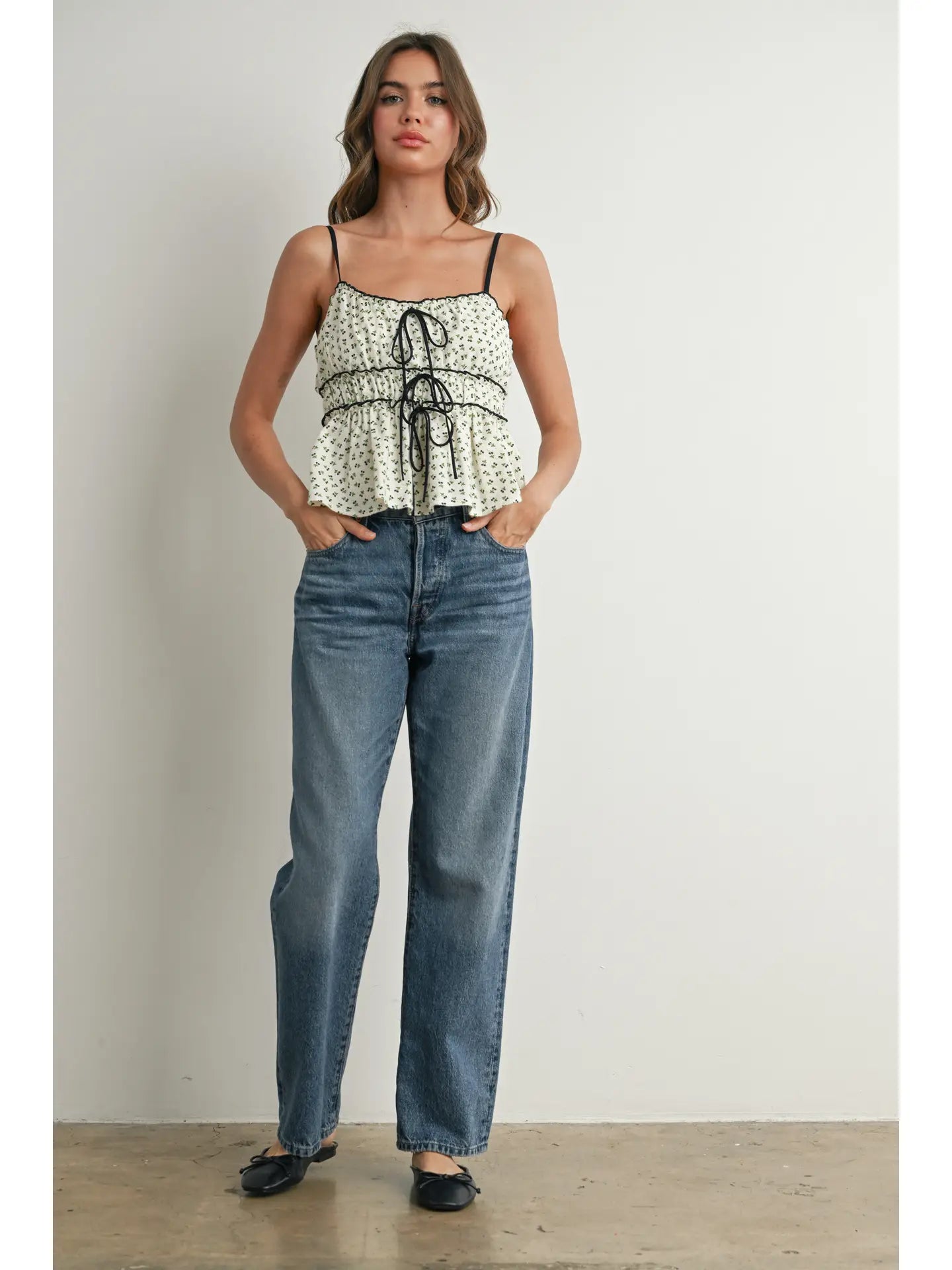 The Cherry Blossom Tie-Front Top is sweet and flirty, featuring a delicate cherry print with ruffled trim and bold red tie details. Designed with adjustable spaghetti straps and a ruched, peplum silhouette, it offers a flattering, feminine fit. The lace-up front adds a playful touch, while the lightweight fabric keeps it breezy and comfortable. Perfect for pairing with denim shorts for a casual day out or layering under a cardigan for a softer look, the Cherry Blossom Tie-Front Top is a must-have for any wardrobe.