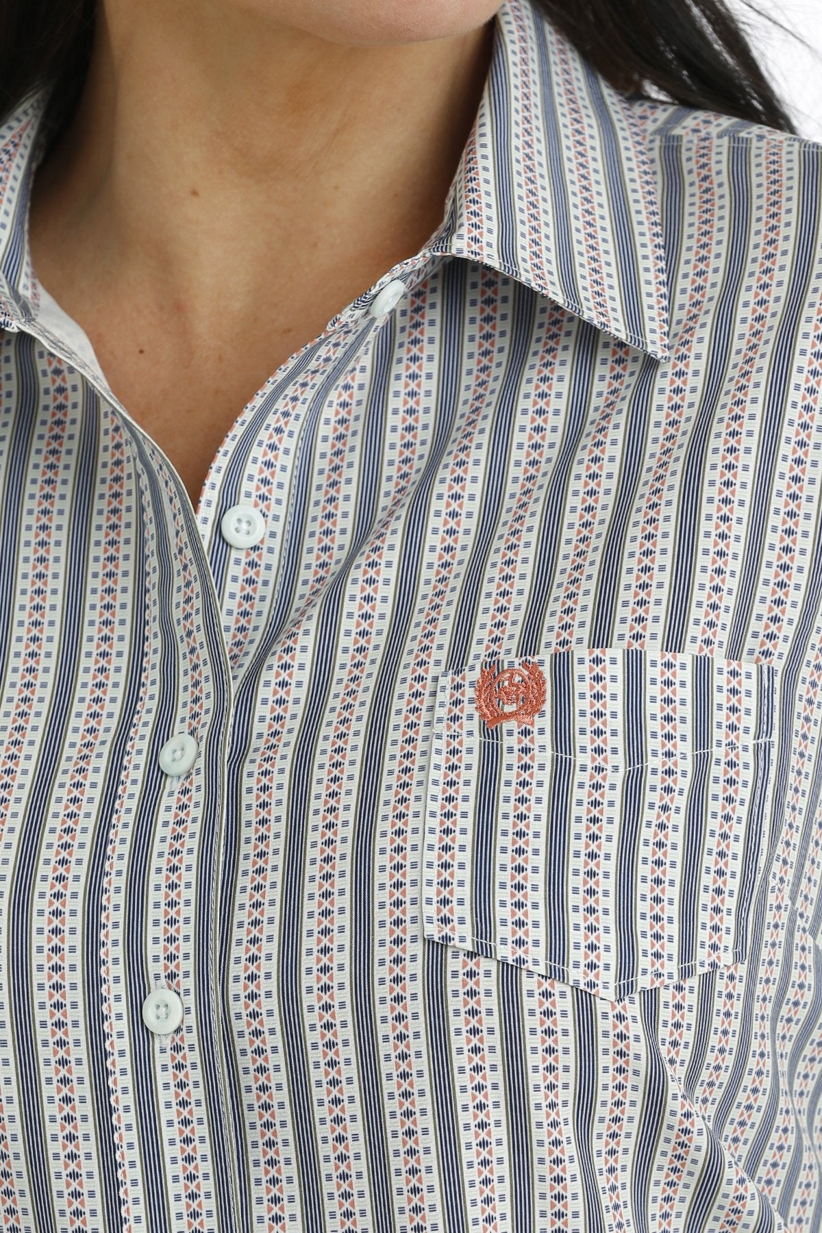 Put together a clean, crisp look with this lightweight multicolor Arenaflex shirt engineered by CINCH. Poly-spandex construction features an open left front pocket with embroidered logo and blue-white marble pearl buttons.