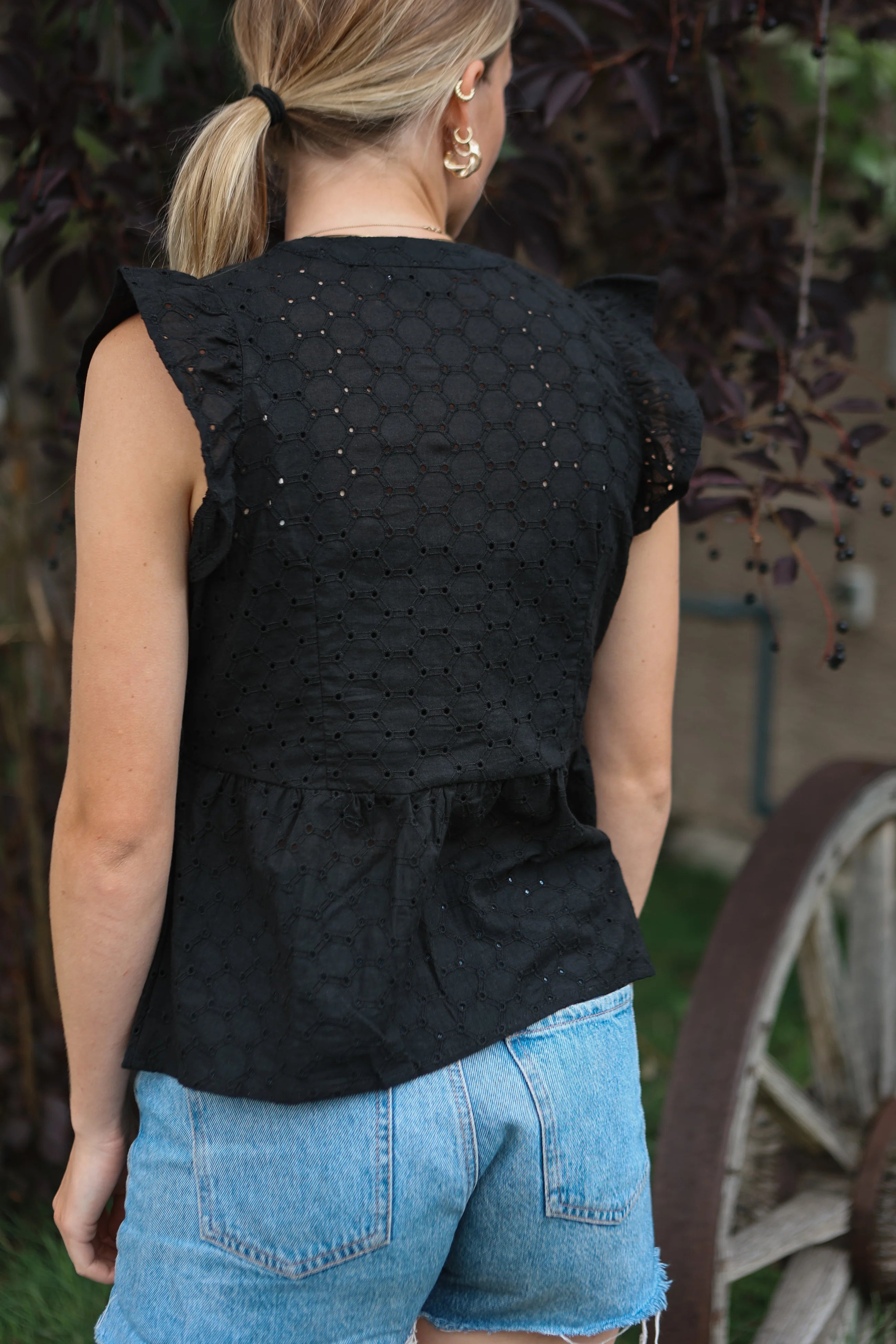 Warm summer days call for something light, pretty, and easy to love like this black cotton sleeveless blouse from Cruel Denim. Soft and breathable with a touch of western charm, it features a flattering deep V neckline, delicate ruffle sleeves, and eye-catching concho buttons. A timeless piece that feels just as good as it looks.