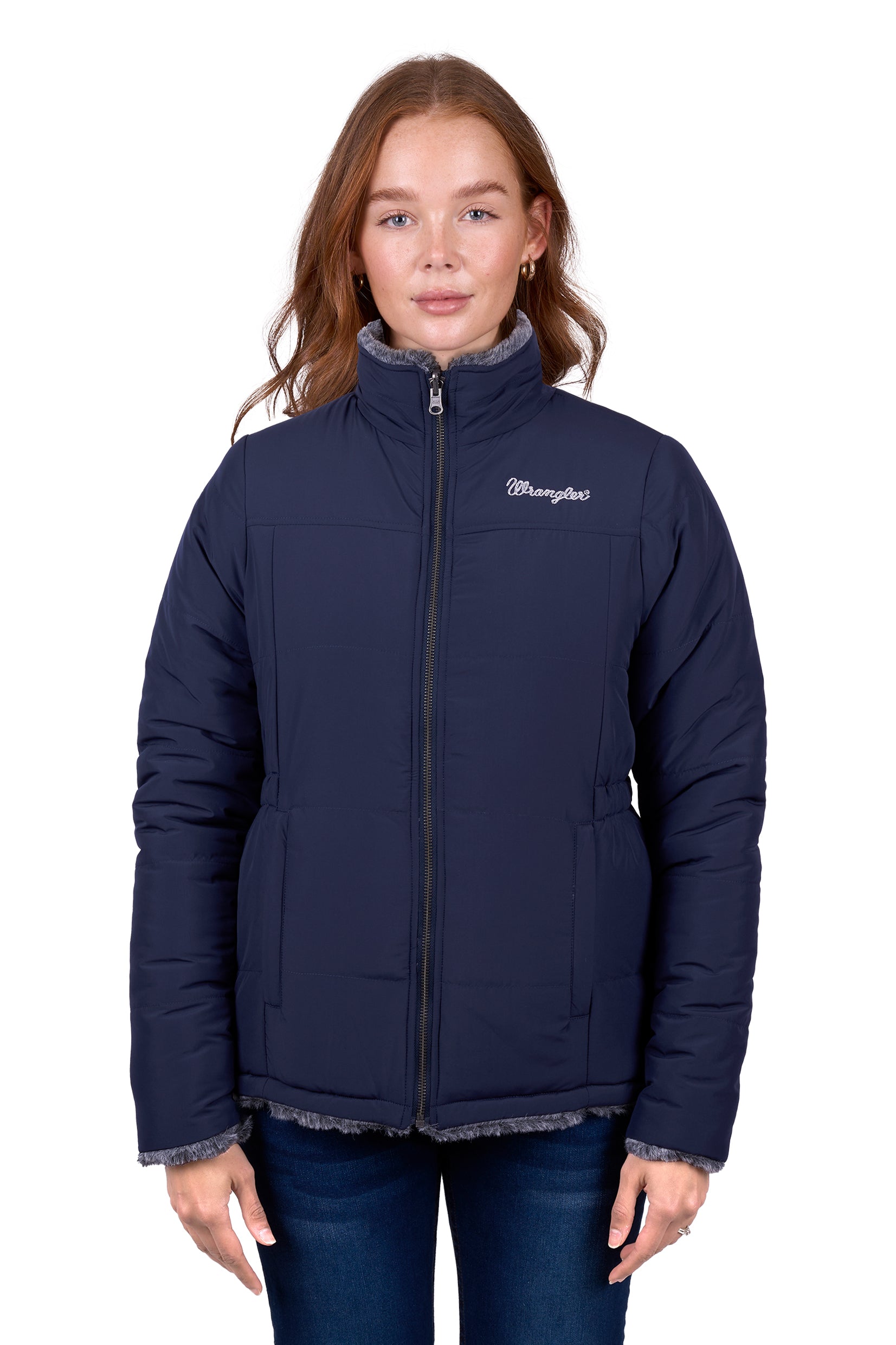 Reversible jacket with fur option, Quilted front and back panels, Wrangler® logo metallic chest embroidery, Side panels for shaping, Elasticated waist detail, Side pockets with concealed zipper closure, Longer curved back hem, Centre front metal zip clos