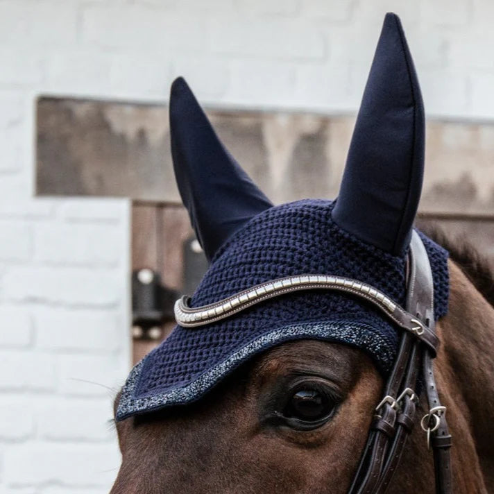 Fly Veil Glitter Stone is a combination of the modern American look and Kentucky Horsewear’s expertise. This fly veil is hand knitted for better durability, finished with a fancy piping and binding in classy glitter stone. The Fly Veil Glitter Stone protects the horse’s ears against flies while riding. The material around the ears is stretch and slim fit. The neck part is longer so it can’t slip. The Fly Veil Glitter Stone does not have a visible logo, therefore rider or sponsors can embroider their own logo. Hand washing only.