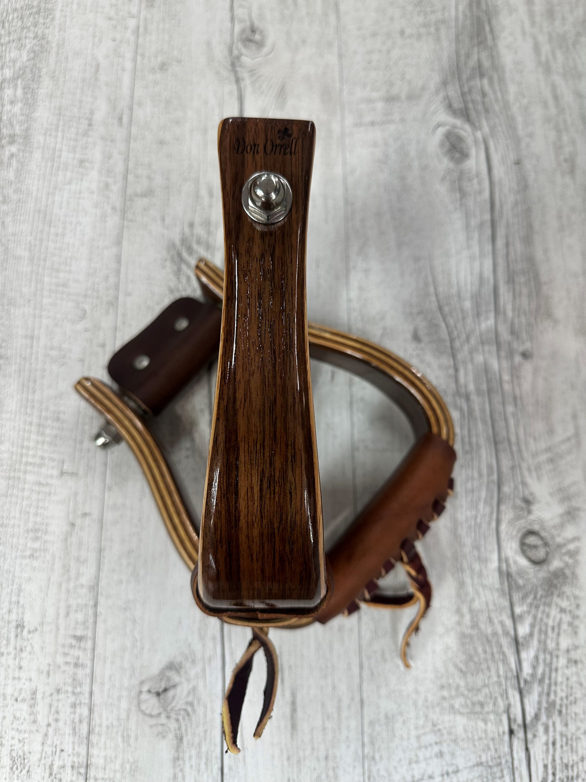 The Flat Bottom Stirrup is a premium, comfortable stirrup for all types of riding. This handcrafted stirrup consists of seven layers of carefully selected laminated wood, softened edges, richly stained leather treads, and two coats of polyurethane finish. This is a great option if you are buying stirrups for a gift as these fit all riding disciplines. ”