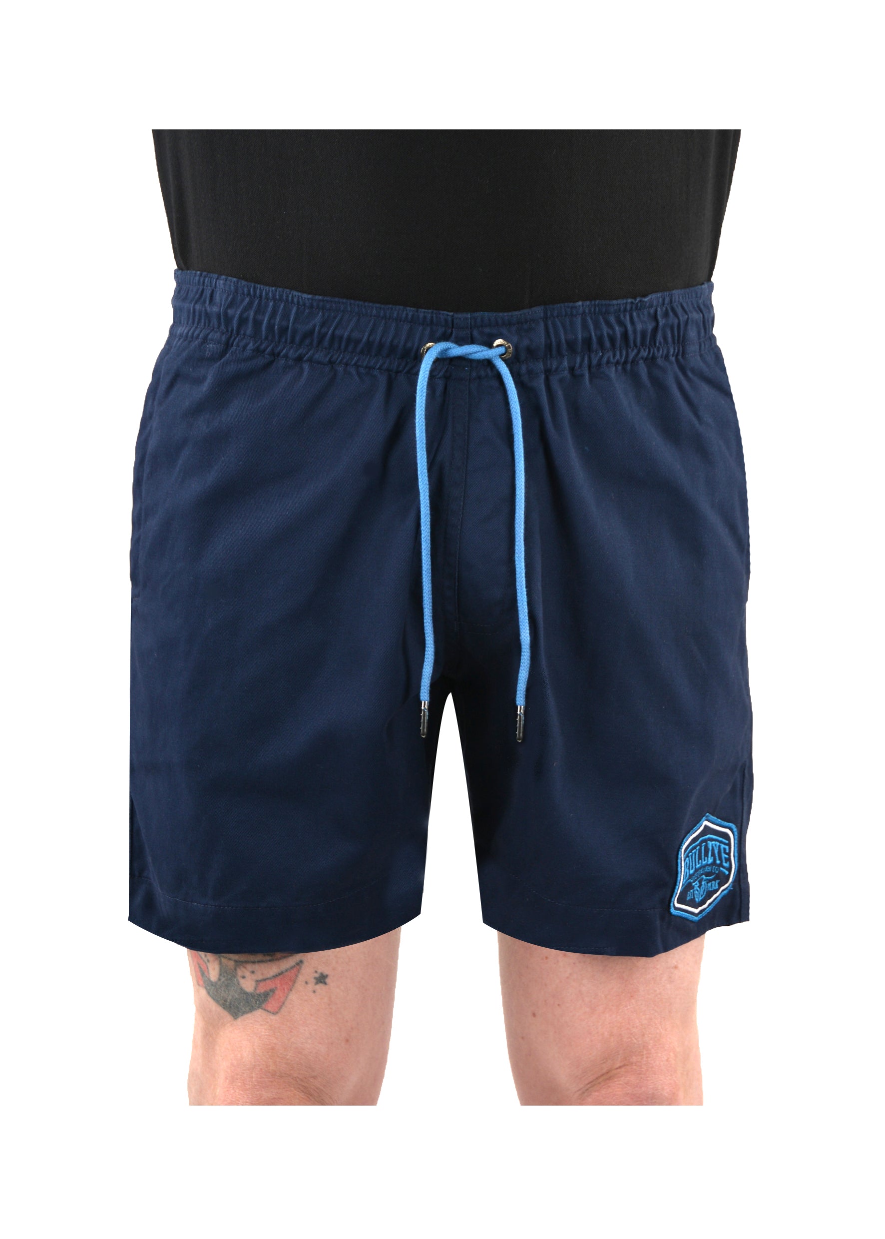 Features: Heavy weight twill short with elasticated waist and contrast waistband facing; Contrast drawcord tie with metal ends; Side welt pockets; Jet pockets on back; Contrast logo embroidery on back; Large embroidered patch on front hem Fabric: 100% Cotton Twill
