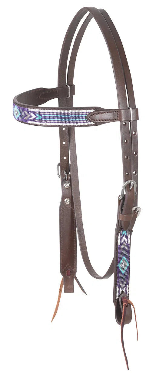 The combination of purple, turquoise, and grey will amke this gorgeous headstall "pop" on any color horse! Made from chocolate skirting leather with Navajo inspired beaded accents at the browband and cheek points. Features stainless steel cheek and throatlatch buckles and water tie bit ends.