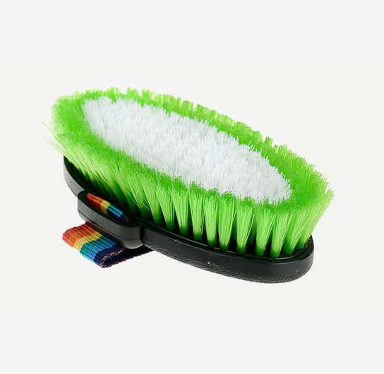 This large basic body brush has short stiff bristles perfect for everyday use on your horse's coat. A durable plastic back with a reinforced rainbow nylon hand strap makes it easy to stay on your hand and not on the ground. Colorful bristles with an inner white core makes this easy to find when grooming. This is a great brush to have around your barn. Short stiff bristles. Durable plastic back. Reinforced rainbow nylon hand strap. Gently removes surface dust particles. Comfortable, easy grip.