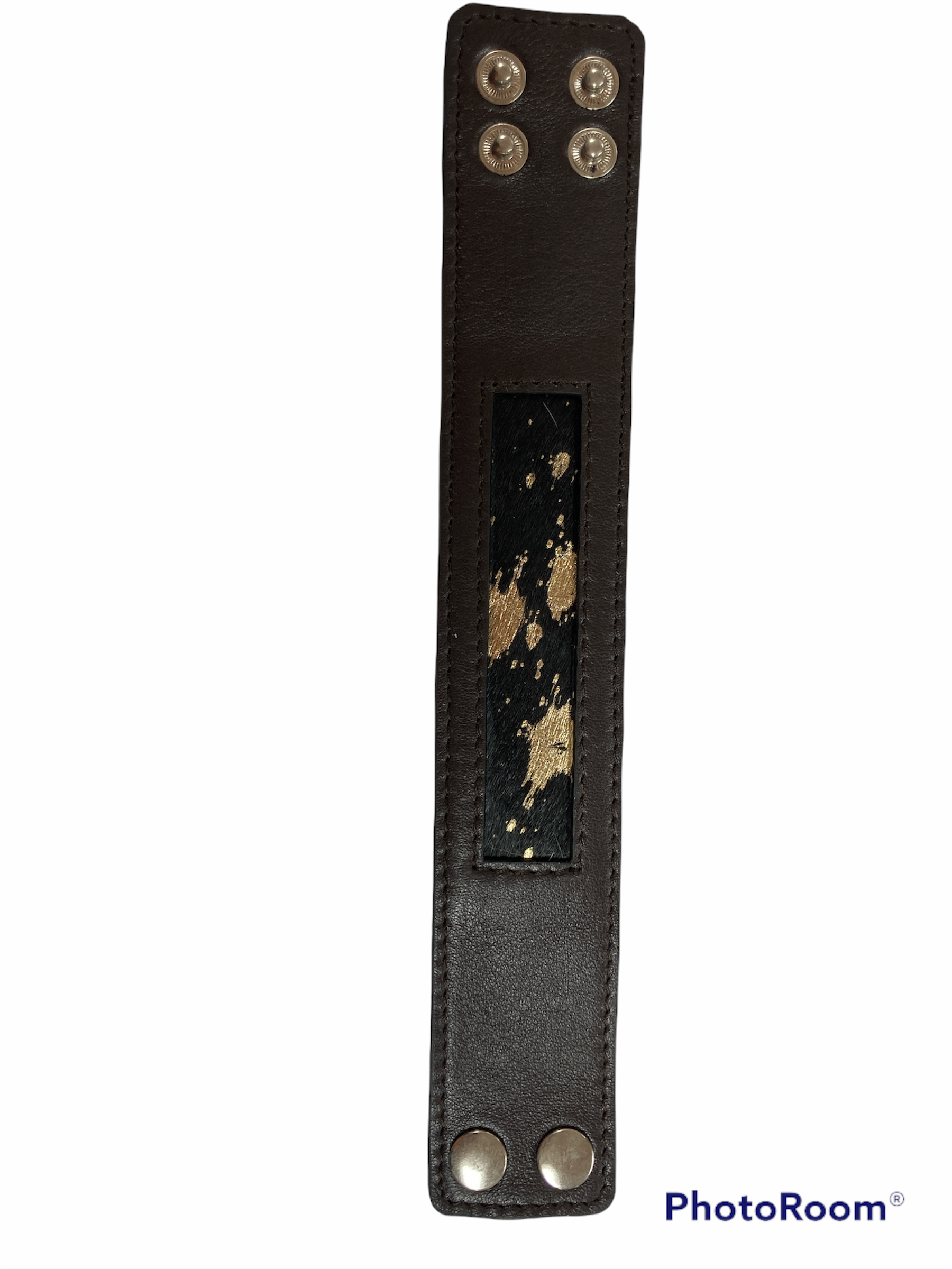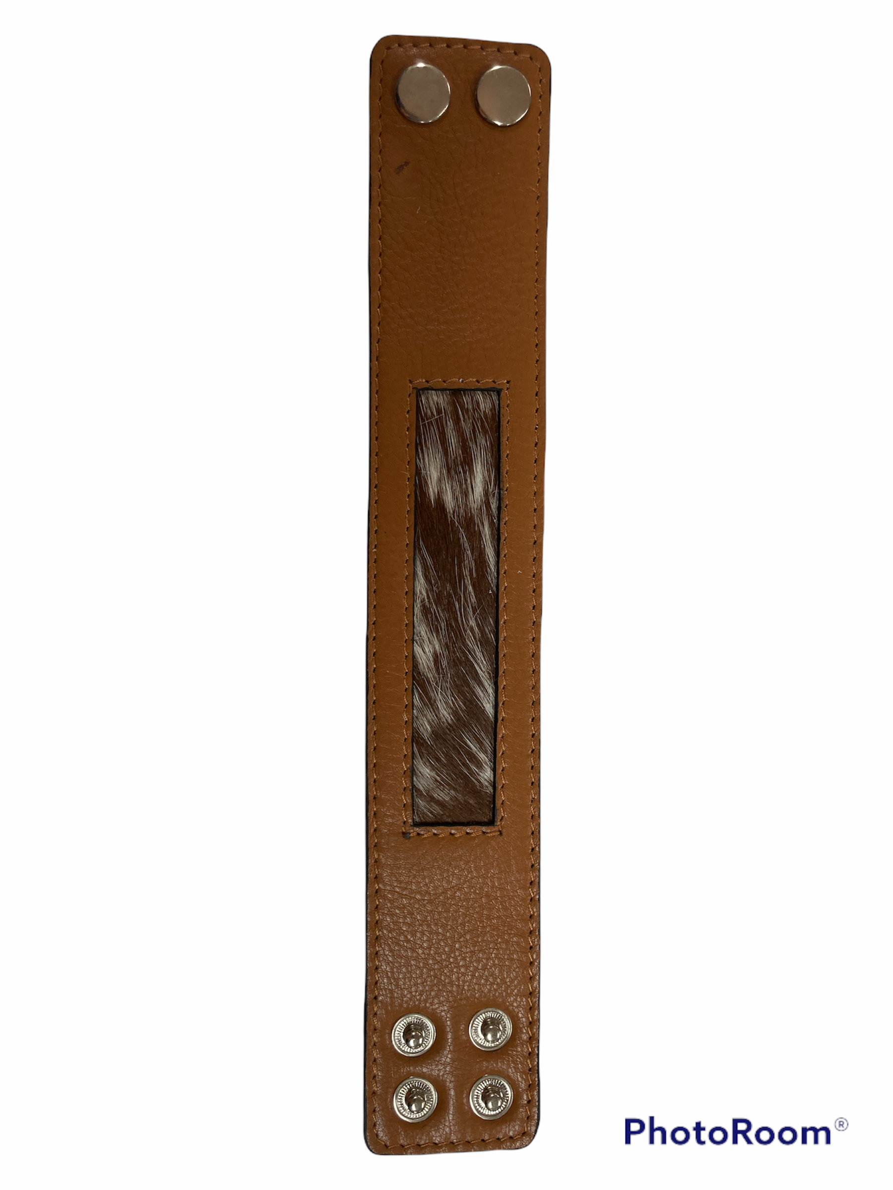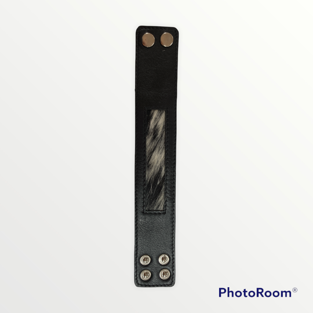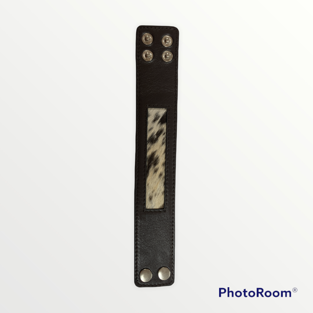 Ruggedly chic, this stylish leather unisex bracelet features Hairon leather on the front panel strip and plain leather body, punctuated by beautiful studs. It can be closed at one of 2 lengths with snaps for a comfortable fit.